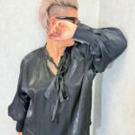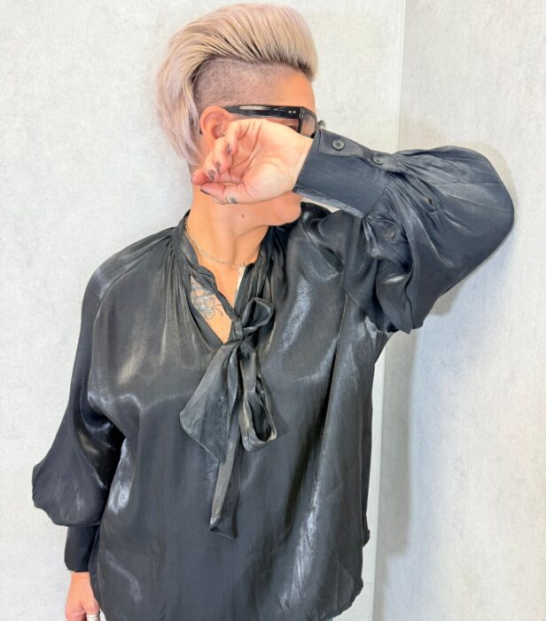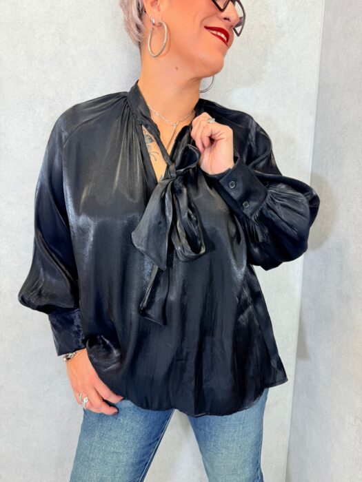 Fluide et légère la blouse noire, col v, satinée allie style et confort. Sa jolie cravate ou son joli noeud, donne une touche tendance de cette saison, lui donne un look boho chic bohème, que l’on adore.