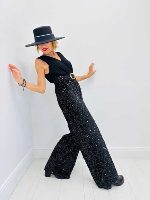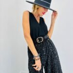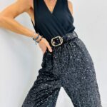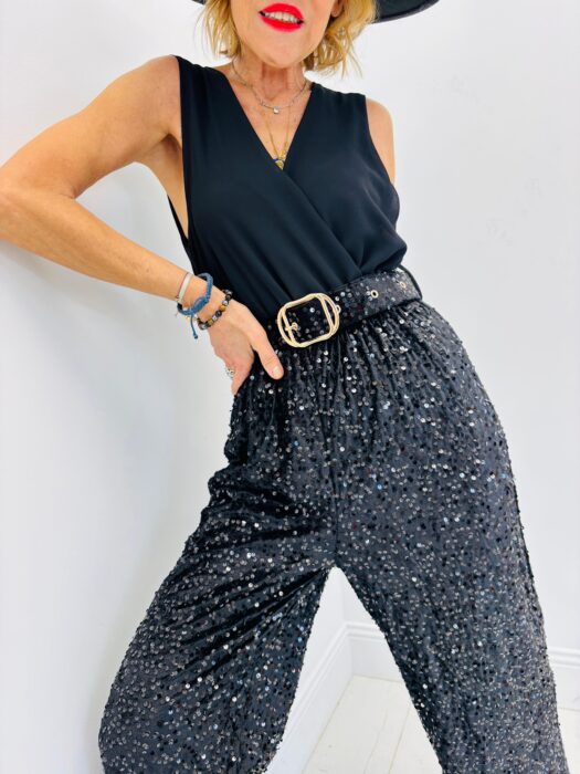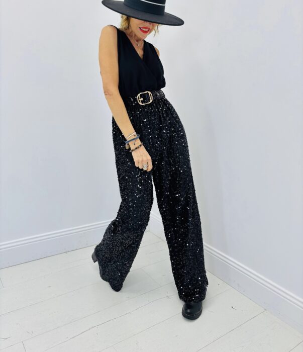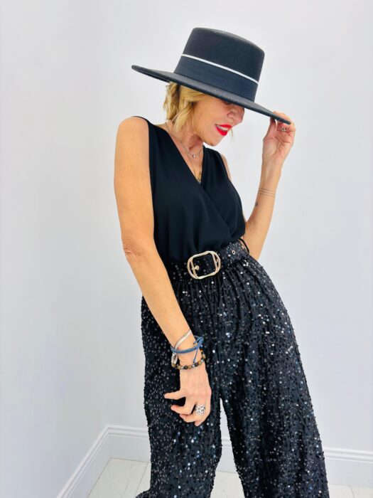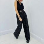 Fluide et léger dans une matière polyester, la combinaison pantalon ANGELINA noir, allie style et confort. Son croisé sur le devant en forme cache coeur noir sans manches, son pantalon droit noir sequin et sa ceinture amovible lui donne une touche tendance de cette saison de fête et un look boho chic bohème, que l’on adore.