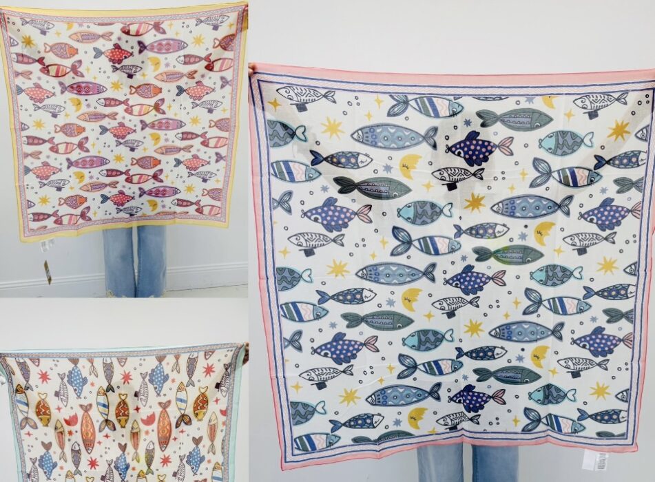 Accessoirisez vos tenues de printemps avec style grâce à ce foulard imprimé de petits poissons… ultra tendance pour cette saison.