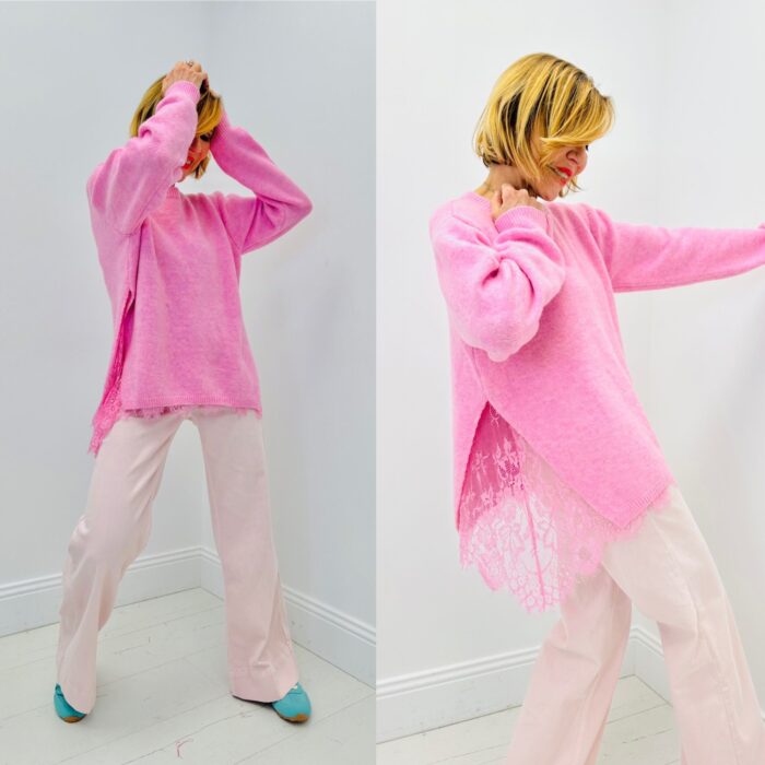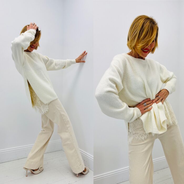 Le pull est un basique de notre dressing à avoir pour un look raffiné. On le retrouve ici avec le pull col rond, manches longues, fendu sur le coté et sa magnifique dentelle cousu aux épaules qui dépassent sur le coté… lui donne un look ultra chic…