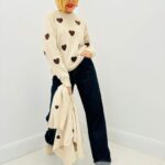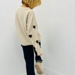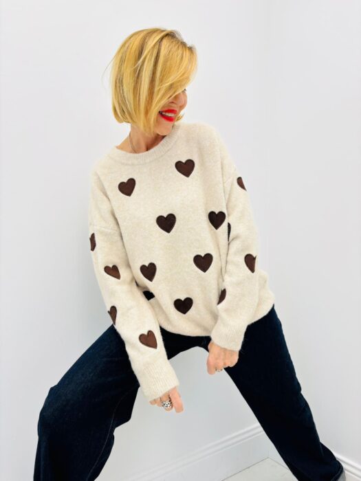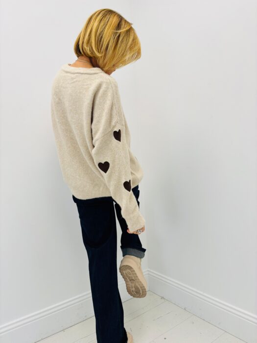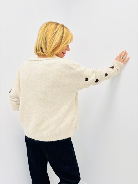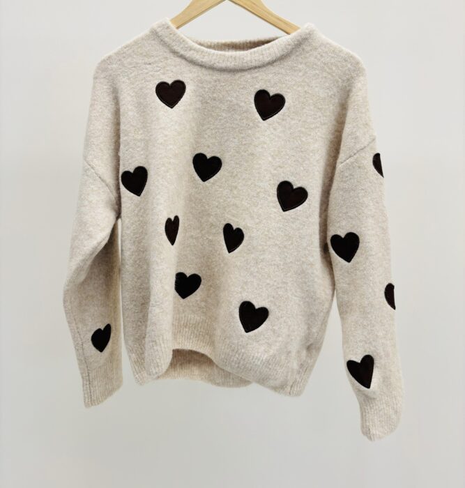 Pull col rond beige motif petit coeur marron