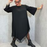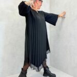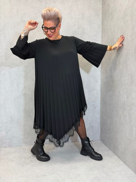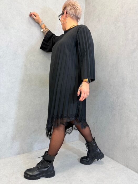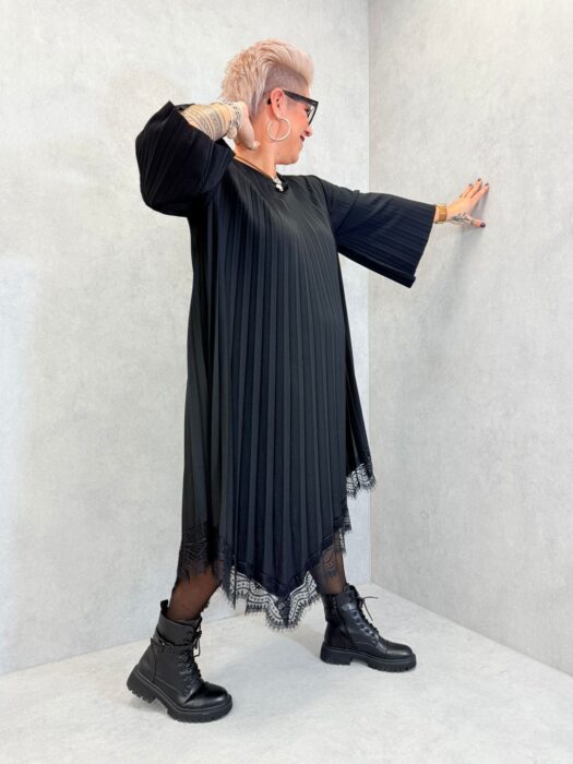 Raffinée, la robe plissée noire, apportera élégance et romance à votre style. En forme pointe avec sa dentelle noire, fait tout son charme et lui apporte un look chic et féminin.