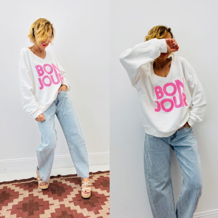 Le sweat en coton est un basique de notre dressing à avoir pour un look décontracté. On le retrouve ici avec en blanc uni en coton écriture sur le devant BONJOUR rose, ultra tendance cette saison.