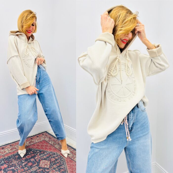 Le sweat en coton est un basique de notre dressing à avoir pour un look décontracté. On le retrouve ici avec en beige uni en coton épais écriture floqué devant et son motif étoile.